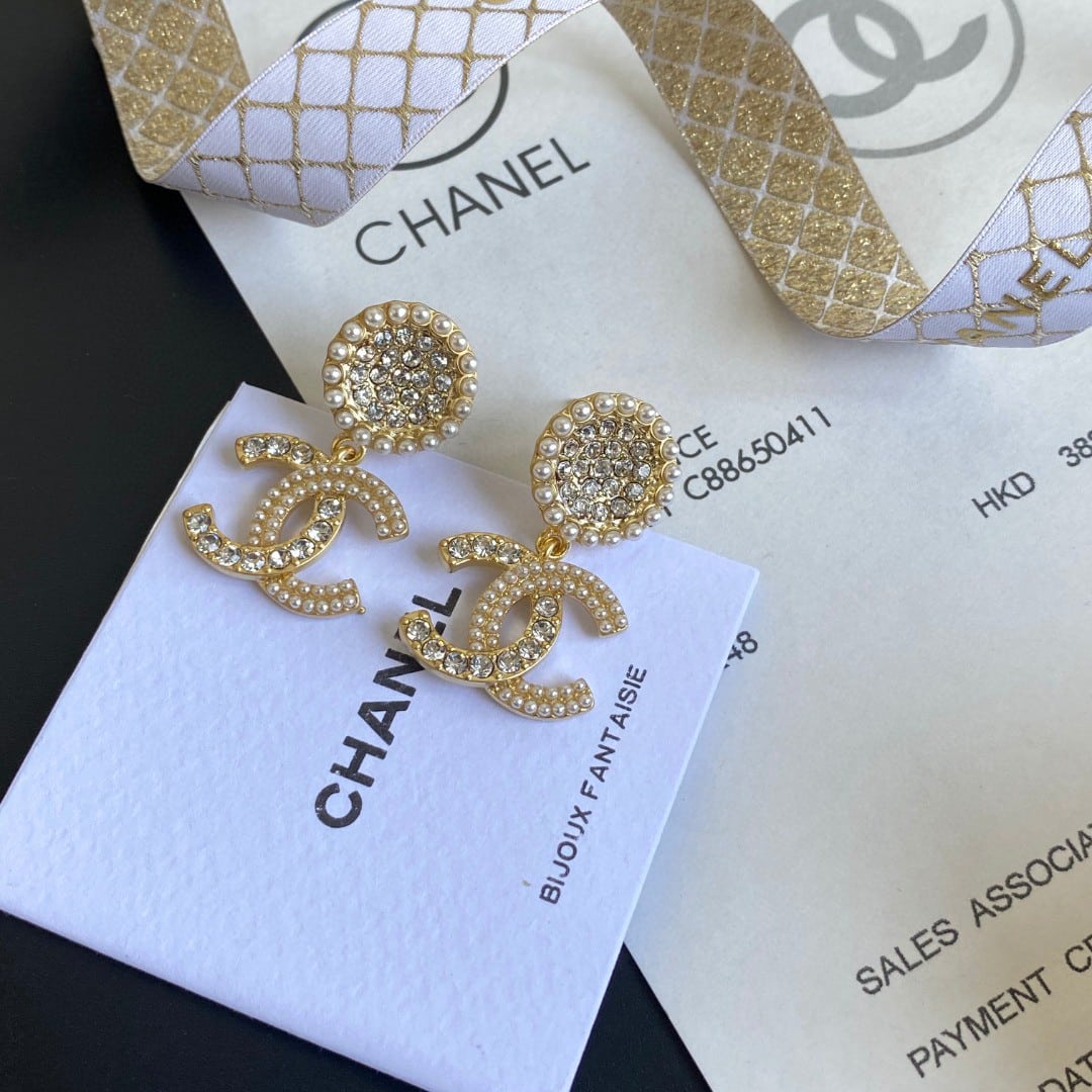 Chanel Crystal Pearl Cc Drop Earrings Gold