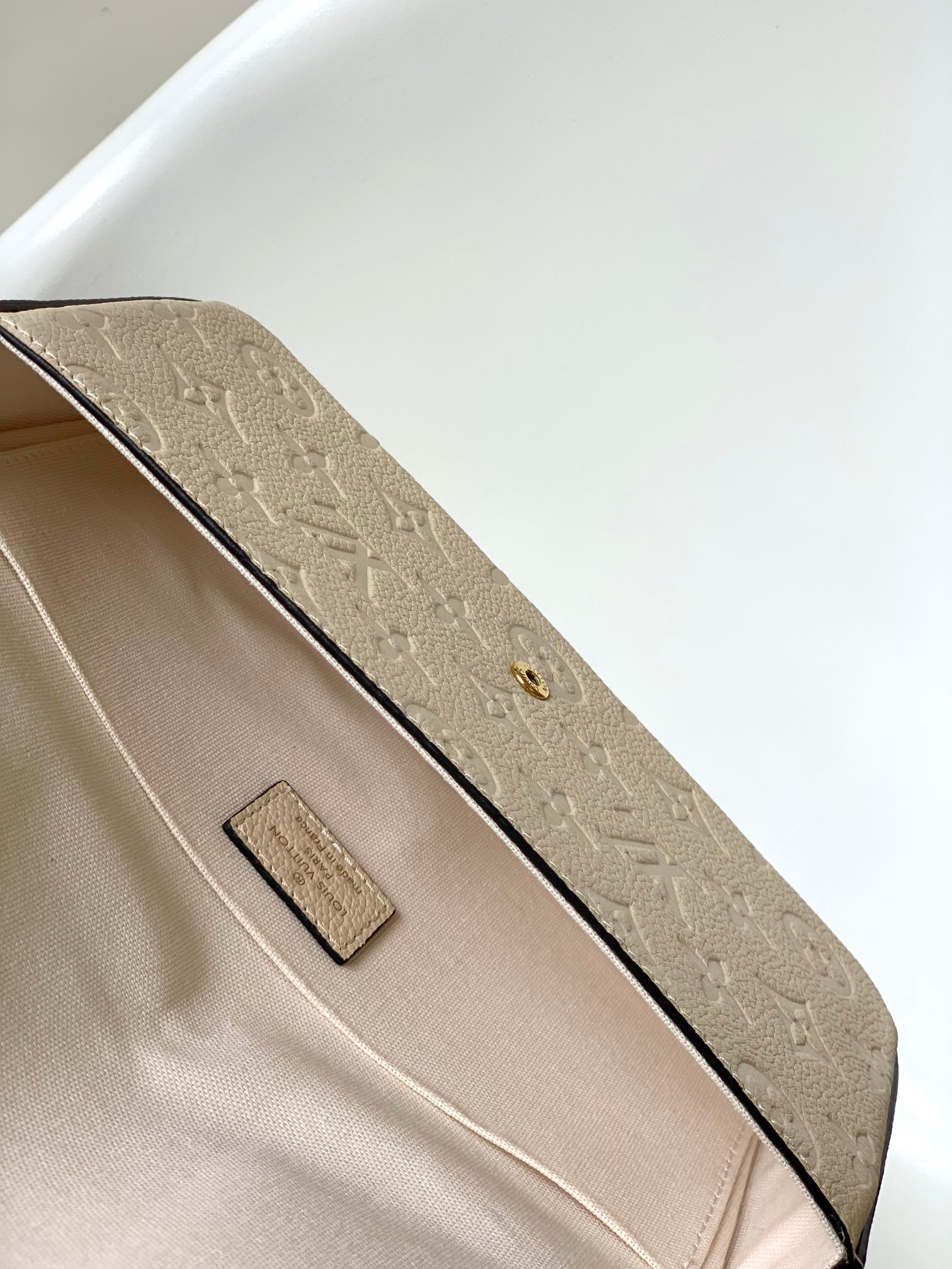The bag has an envelope-shaped design with 1 large compartment including 2 removable sub-compartments, one of which has a zipper and the other has card slots.