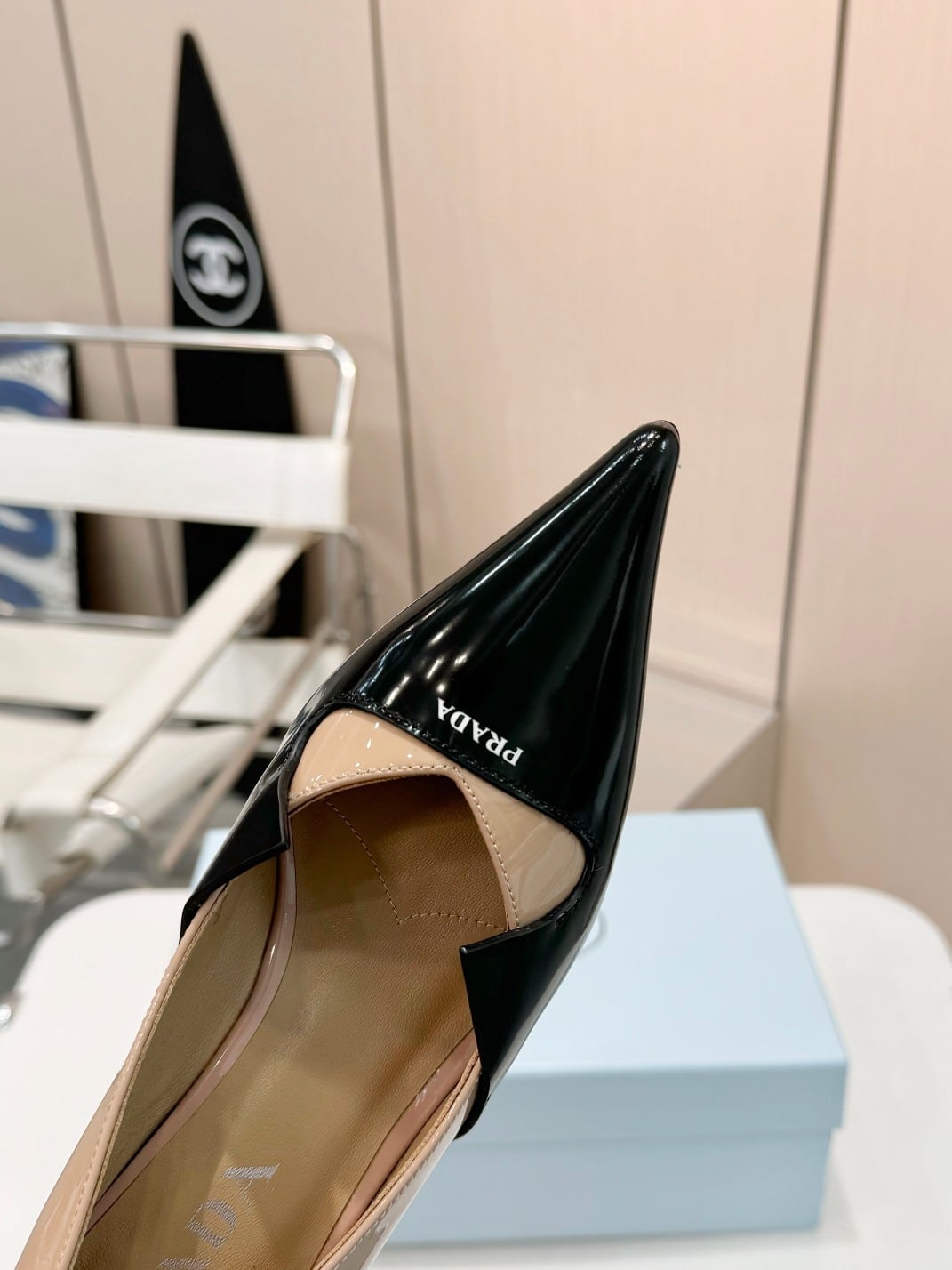 PRADA TWO TONE TOE KITTEN HEELS IN BLACK AND BEIGE